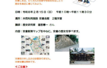 「歩き」「見て」「知る」自然と歴史がいきづくまち安倉の歴史を感じてみませんか? 安倉の歴史学習会を開催致します。 安倉にある、たくさんの史跡や寺院を知ることで歴史を身近に感じてみよう。 日時:令和8年2月15日(日)午前…