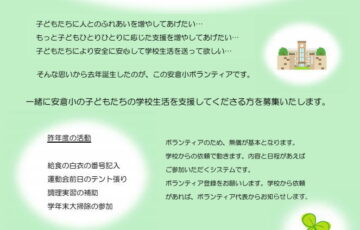 地域のみなさま・保護者のみなさまへ 子どもたちのために お力をおかしください 安倉小学校 ボランティアメンバーを募集しています。 子どもたちに人とのふれあいを増やしてあげたい・・・ もっと子どもひとりひとりに応じた支援を…