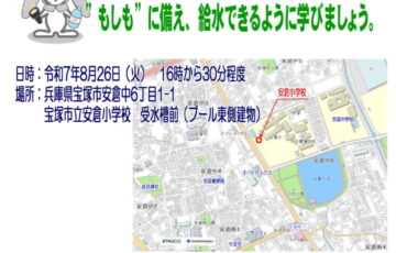 ”もしも”に備え、給水できるように学びましょう。 安倉小学校受水槽応急給水設備設置訓練 災害での断水に備え、受水槽から給水できるように訓練を行います。 日時:令和7年8月26日(火)16時から30分程度 場所:兵庫県宝塚…