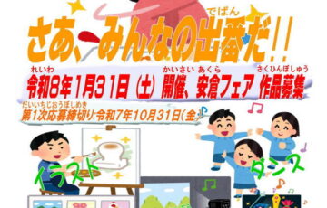 安倉の才能あつまれ! さあ、みんなの出番だ!! 令和8年1月31日(土)に開催される「安倉フェア」の作品を募集しています。 イラスト(絵)、写真、動画(映像)、ダンス、演劇など、 日頃趣味でやっていることや、見てもらいた…