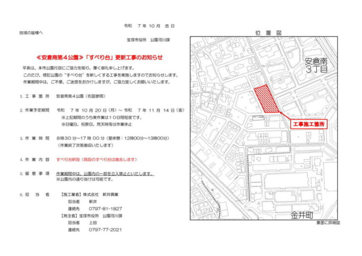 工事期間中、工事関係車両が出入りしたりすることとなりますので、公園等利用される際にご注意下さい。