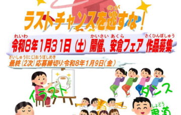 安倉の才能あつまれ! ラストチャンスを逃すな!! 令和8年1月31日(土)に開催される「安倉フェア」 ”出展申し込み忘れてた”との声から、出展作品の最終(2次)募集します。 イラスト(絵)、俳句・川柳、演奏、ダンス、書道…
