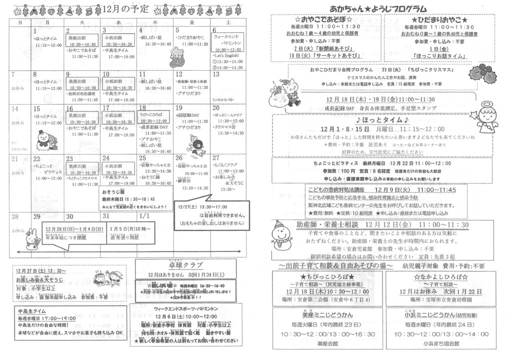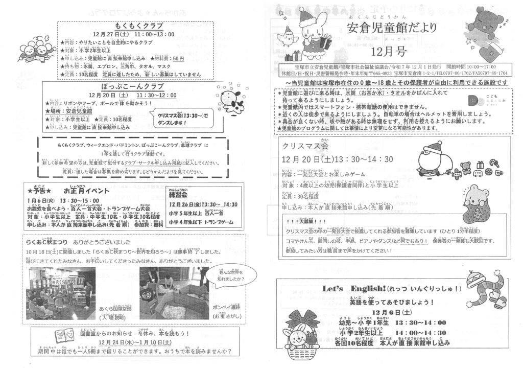 2025.12.01 学校だより このページを印刷 コミュニティ安倉 「安倉児童館」からお知らせが届きました。(12月) 「安倉児童館」からお知らせが届きました。 今回届きましたお知らせは以下の通りです。 「安倉児童館だより 12月号」は、下記リンクからPDFデータがご覧頂けます。 ・安倉児童館だより12月号(PDF) 宝塚市立安倉児童館ホームページ(外部リンク)