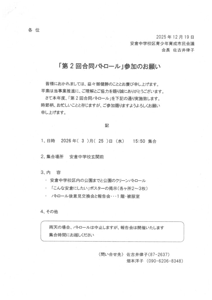 令和7年度 第2回合同パトロール参加の御願い (3/25)