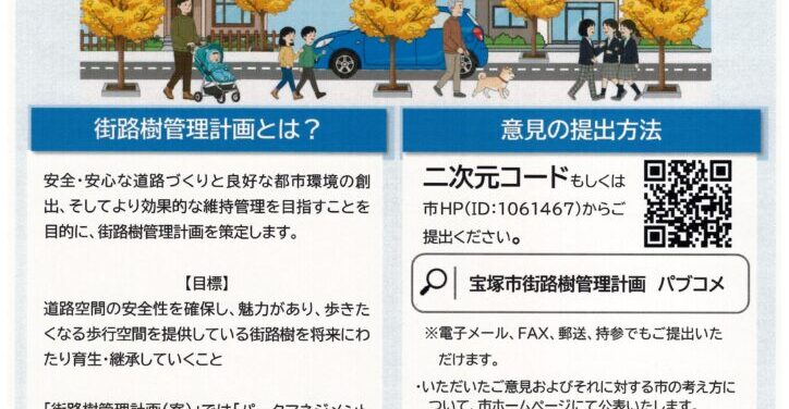 宝塚市街路樹管理計画(案)にあなたの声を届けて下さい。 パブリック・コメントが実施されています。 街路樹管理計画とは? 安全・安心な道路づくりと良好な都市環境の創出、そしてより効果的な維持管理を目指すことを目的に、街路樹 … 続きを読む 「みんなの街路樹」ご意見募集が始まりました。(R8.1/26まで)