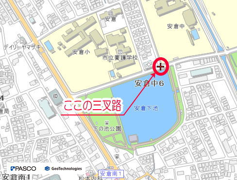 安倉中学校南角の三叉路(信号機が撤去された所)で