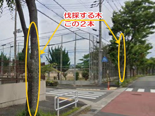 中学校側から一旦停止した車が植栽があることで交差する車両が見えにくいことから左右直近の各1本(計2本)を伐採し鋪装を直す工事が行われます。