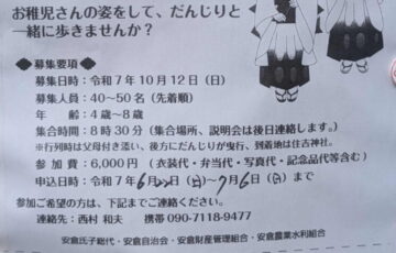 安倉住吉神社 鎮座千二百年祭 お稚児さん(男女4歳~8歳まで)募集してます。 お稚児さんの姿をして、だんじりと一緒に歩きませんか? << 募集要項 >> 募集日時:令和7年10月12日 募集人員:…