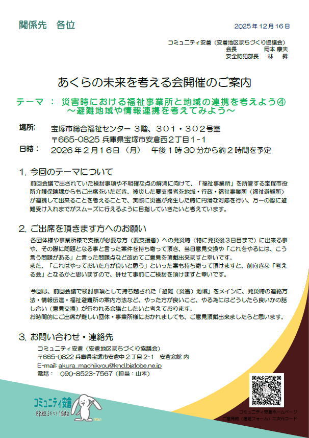 前回会議で出されていた検討事項や不明確な点の解消に向けて、「福祉事業所」を所管する宝塚市役所介護保険課からもご出席をいただき、被災した要支援者を地域・行政・福祉事業所(福祉避難所)が連携して出来ることを考えることで、実際に災害が発生した時に円滑な対応を行い、万一の際に避難受け入れまでがスムーズに行えるように目指していきたいと考えています。