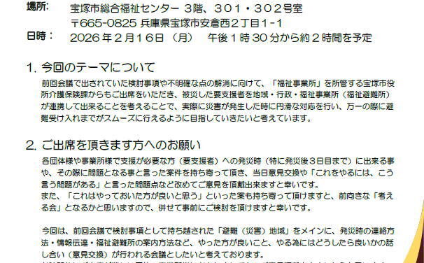 イベント詳細 日付: 2026年2月16日 1:30 PM – 3:30 PM カテゴリ: 会議 あくらの未来を考える会を開催致します。 テーマ : 災害時における福祉事業所と地域の連携を考えよう③ ~在宅避 … 続きを読む あくらの未来を考える会開催