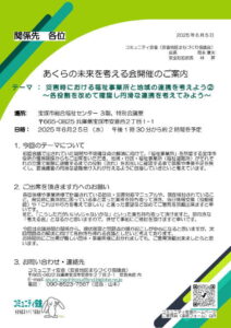 各団体様や事業所様で計画されている防災・災害対応マニュアルや、現在検討されていること、発災時に具体的に困っている事と言った案件を持ち寄って頂き、当日情報交換(役割確認)や「これはやり方を考えて欲しい」と言った要望など改めてご意見を頂戴出来ますと幸いです。