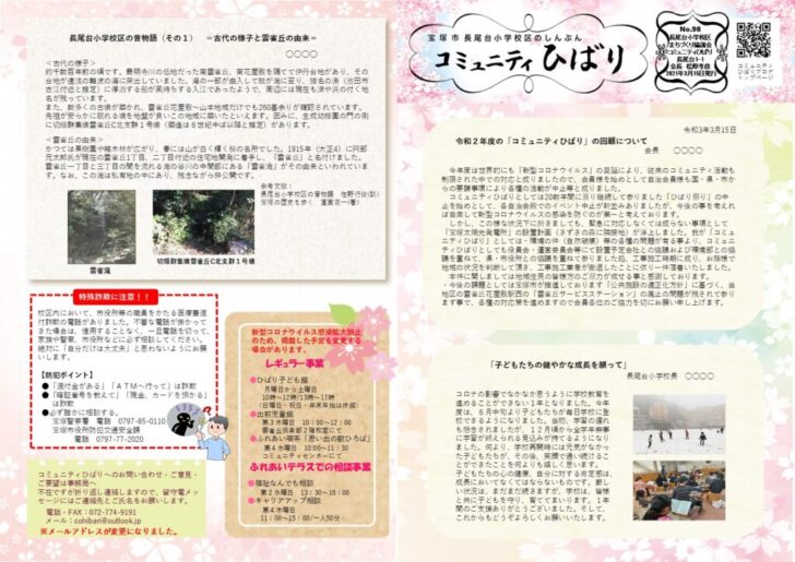 2021.03.14 広報紙 このページを印刷 コミュニティひばり コミュニティひばりしんぶん98号 コミュニティひばりしんぶん98号を発行しました。 今年度の活動報告、最近増加している詐欺電話への注意喚起のほか、長尾台小学校区の歴史について掲載しています。 コミュニティひばりのメールアドレスが変わりましたので、新しいメールアドレスを4面に掲載しています。 コミュニティひばりしんぶんは自治会を通じて配布されるほか、市役所、サービスステーション、コミュニティセンターひばりにも置いています。 皆様、是非ご覧ください。 ↓PDFファイルはこちら しんぶん98号表面 しんぶん98号裏面