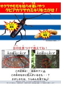 (クビアカツヤカミキリを生きたまま持ち運ぶことは違法となります。)