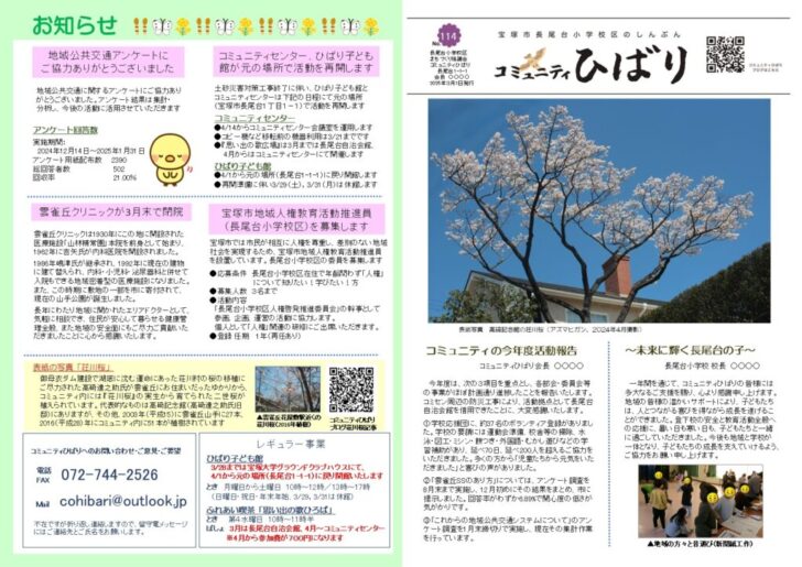 2025.03.02 広報紙 このページを印刷 コミュニティひばり コミュニティひばりしんぶん114号 コミュニティひばりしんぶん114号を発行しました。 今号の特集は今年度の活動報告です。 自治会を通じて配布するほか雲雀丘サービスステーションにも配架していますので、お手に取ってご覧ください。 ↓画像をクリックするとPDFを表示します