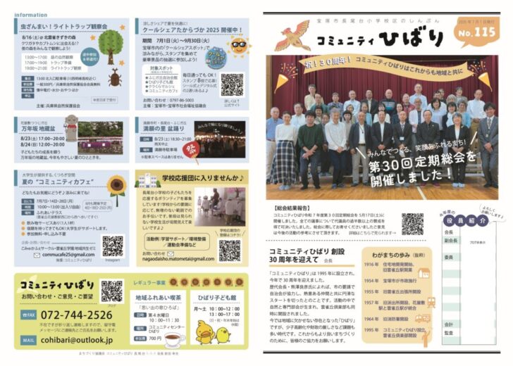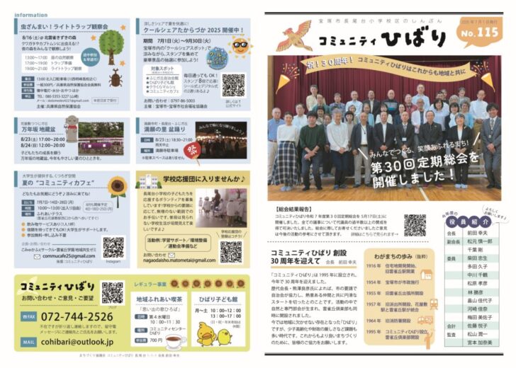 2025.07.11 広報紙 このページを印刷 コミュニティひばり コミュニティひばりしんぶん115号を発行しました コミュニティひばりしんぶん115号を発行しました。 今号は中面が『これからの地域公共交通についてのアンケート』の結果報告とサロンマップ、4面には地蔵盆など夏の行事を掲載しています。 自治会を通じて配布するほか、雲雀丘サービスステーションやコミュニティセンターひばりにも配架しましたので、お手に取ってご覧ください。 ↓画像をクリックするとPDFを表示します