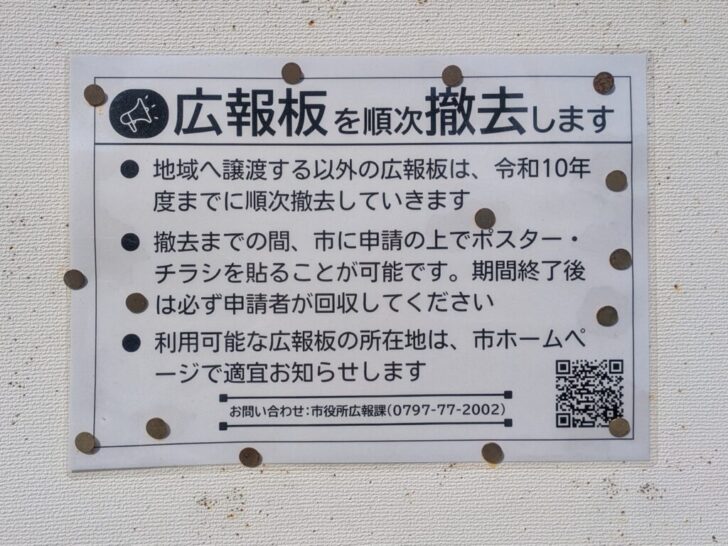 一部の広報板は令和8~9年度に希望のあった自治会やまちづくり協議会に譲渡され、譲渡先の掲示板として使用されますが、譲渡の希望がなかった広報板は令和8年度から順次撤去されます。