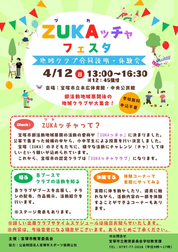 宝塚(ZUKA)の子どもたちに、様々な活動にチャレンジ(チャ)してほしいという願いが込められています。これから、宝塚市の認定クラブは「ZUKAッチャクラブ」になります。