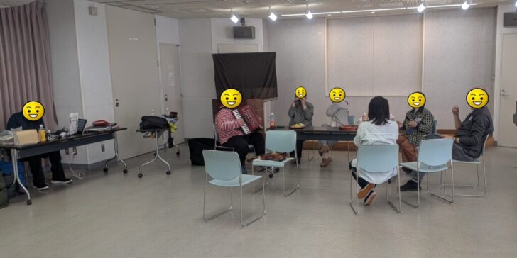 『きらきら星』をバラードやワルツ、チャチャチャなどに即興アレンジした合奏にも挑戦、『皆さんの一芸披露』では持ち寄った楽器の色々な面が知れて大盛り上がりでした。