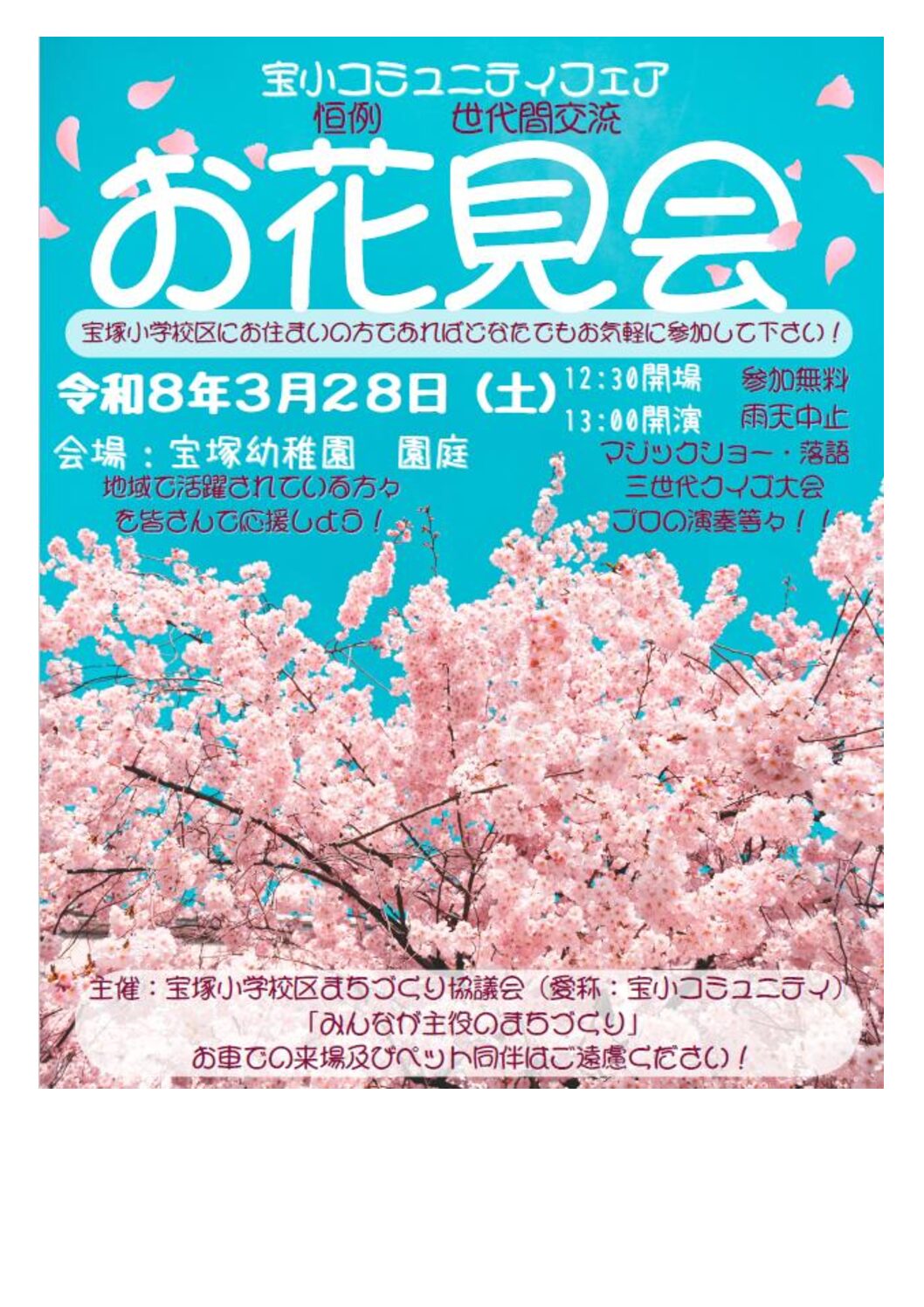 3月29日(土)12:30開場・13:00開演 参加無料ですので皆さんお誘い合ってご来場ください。今年は特別企画として「マジックショー」を予定しております。 3世代別クイズ大会も開催します!