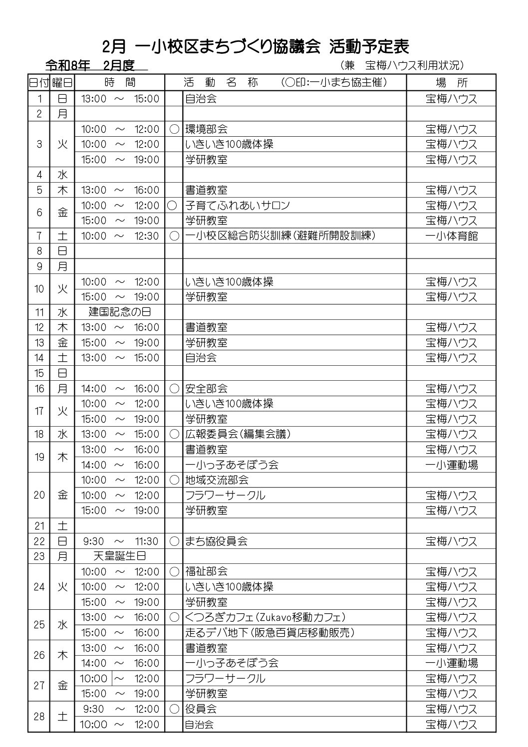 令和8年2月の一小校区まちづくり協議会の活動予定表です。 毎月の定例行事に加えてスポット行事があります。 ❶ 6日(金)子育てふれあいサロン 宝梅ハウス ❷ 7日(土)一小校区総合防災訓練 一小体育館…