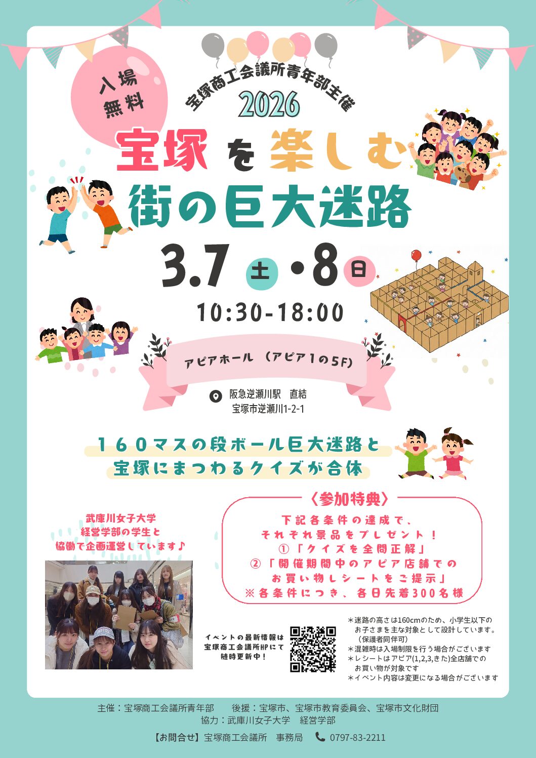 商工会議所青年部主催のイベントが3月7日(土)8日(日)の 2日間開催されます。 会場はアピアホール 時間は10:30〜18:00 『宝塚を楽しむ街の巨大迷路』と題して、特に小学生以下の お子さまが楽しめます。 楽しい…