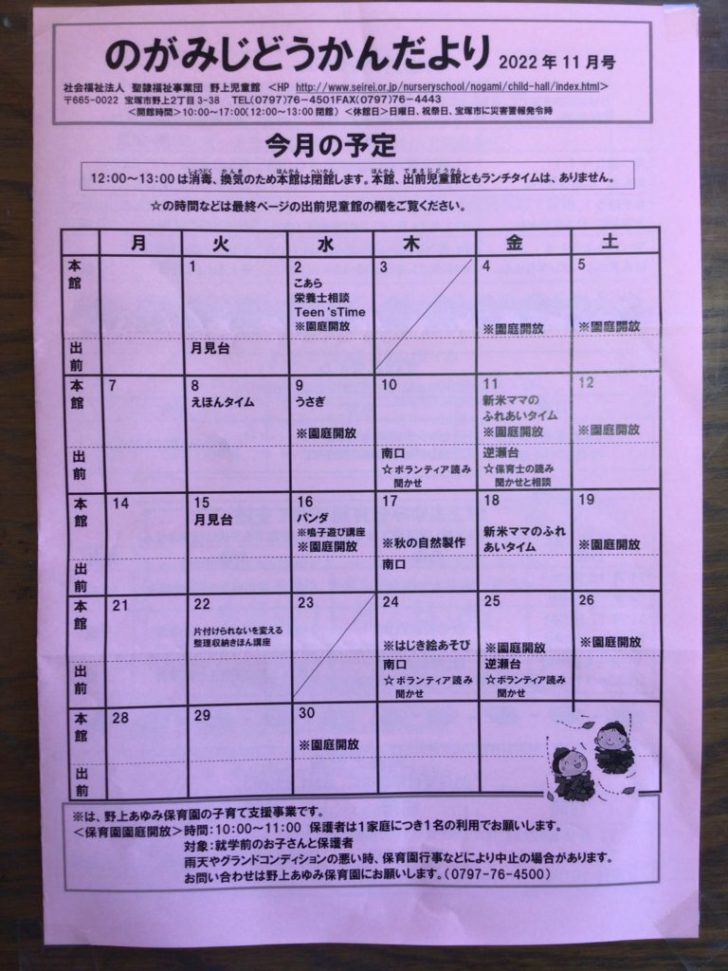 出前児童館もあり、月見台出前児童館(毎月第1、第3火曜日)と南口出前児童館(宝塚公会堂 毎週木曜日)でそれぞれ開催されています。
