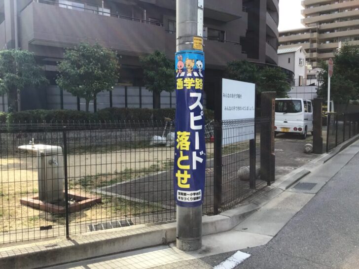 武庫山2丁目付近の通学路に交通安全電柱幕を新調しました。