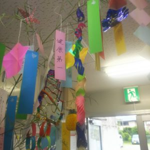 みんなで短冊に願いを書いたり。折紙で笹かざりを作ります。