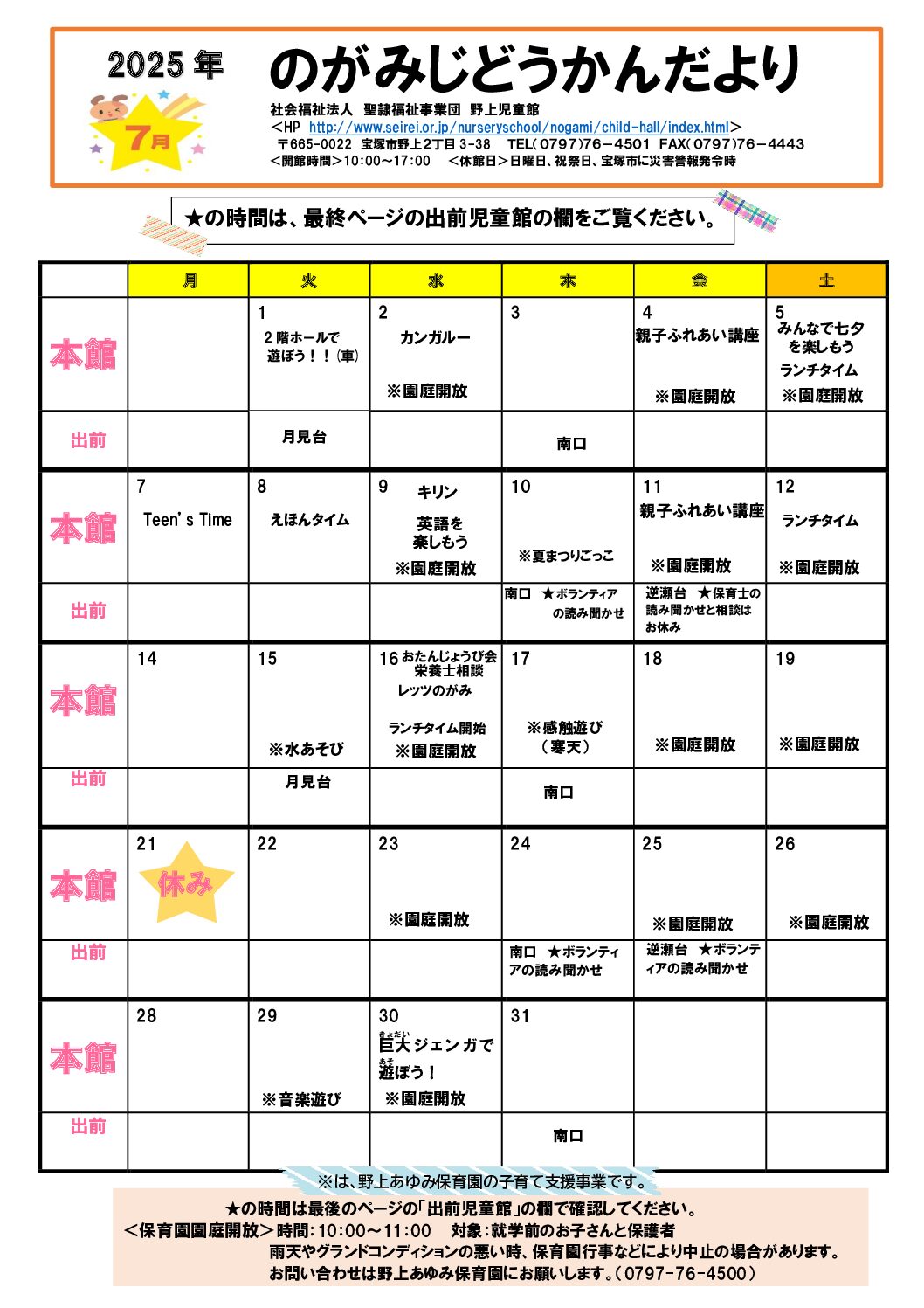 7月の『のがみじどうかんだより』です。 市内には7ヵ所の児童館があります。 一小校区の皆様は野上児童館(野上2-3-38)をご利用下さい。 校区内では出前児童館が2ヵ所で開かれています。 ❶第1・第3火曜日(1日、15日…