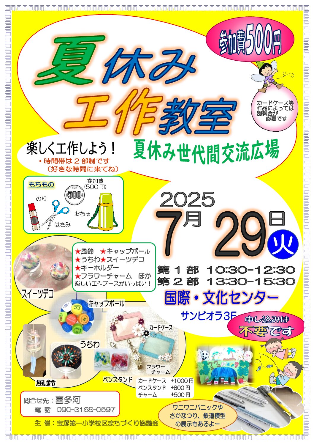 7月29日(火)宝塚南口の国際・文化センター(サンビオラ3階)にて世代間交流広場『夏休み工作教室』を開催しました。 午前10:30〜12:30、午後1:30〜3:30の2部制です。 開始早々から大勢の皆さんが来場されまし…