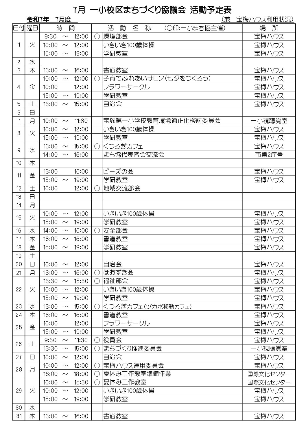 7月の宝塚第一小学校区まちづくり協議会の活動予定表です。 毎月の定例行事に加えてスポット行事があります。 ①1日(火)環境部会 ②4日(金)子育てふれあいサロン ③9日(水)& 23日(水) くつろぎカフェ ④1…
