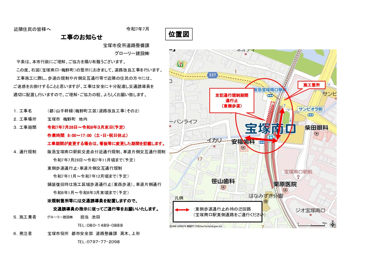 令和7年2月より阪急宝塚南口駅と旧宝塚ホテル前の車道(聖天通り線)及び道路拡幅工事の為に道路下を流れる「亥の谷川」の暗渠工事は予定通り進んでいます。 この度、新たに旧宝塚ホテル前の東西歩道等の改良工事が始まります。 ❶工…