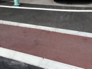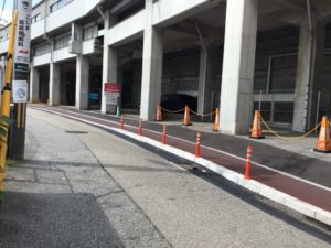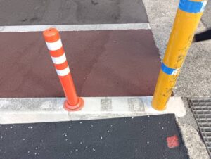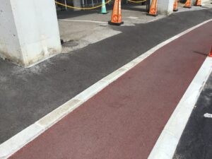 高架下駐車場入口付近にも歩道(マルーン色)(アスファルト)の境目に1㎝〜3㎝の僅かな段差がありますのでくれぐれもご注意下さい。