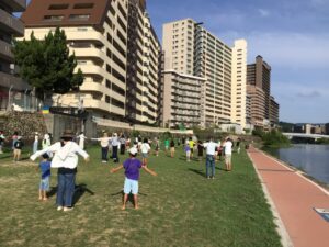 一小校区内では夏休み期間中に9ヵ所でラジオ体操が開催され、延べ2,500人の皆さんが参加されました。