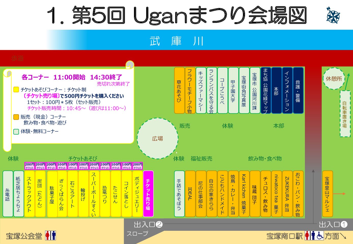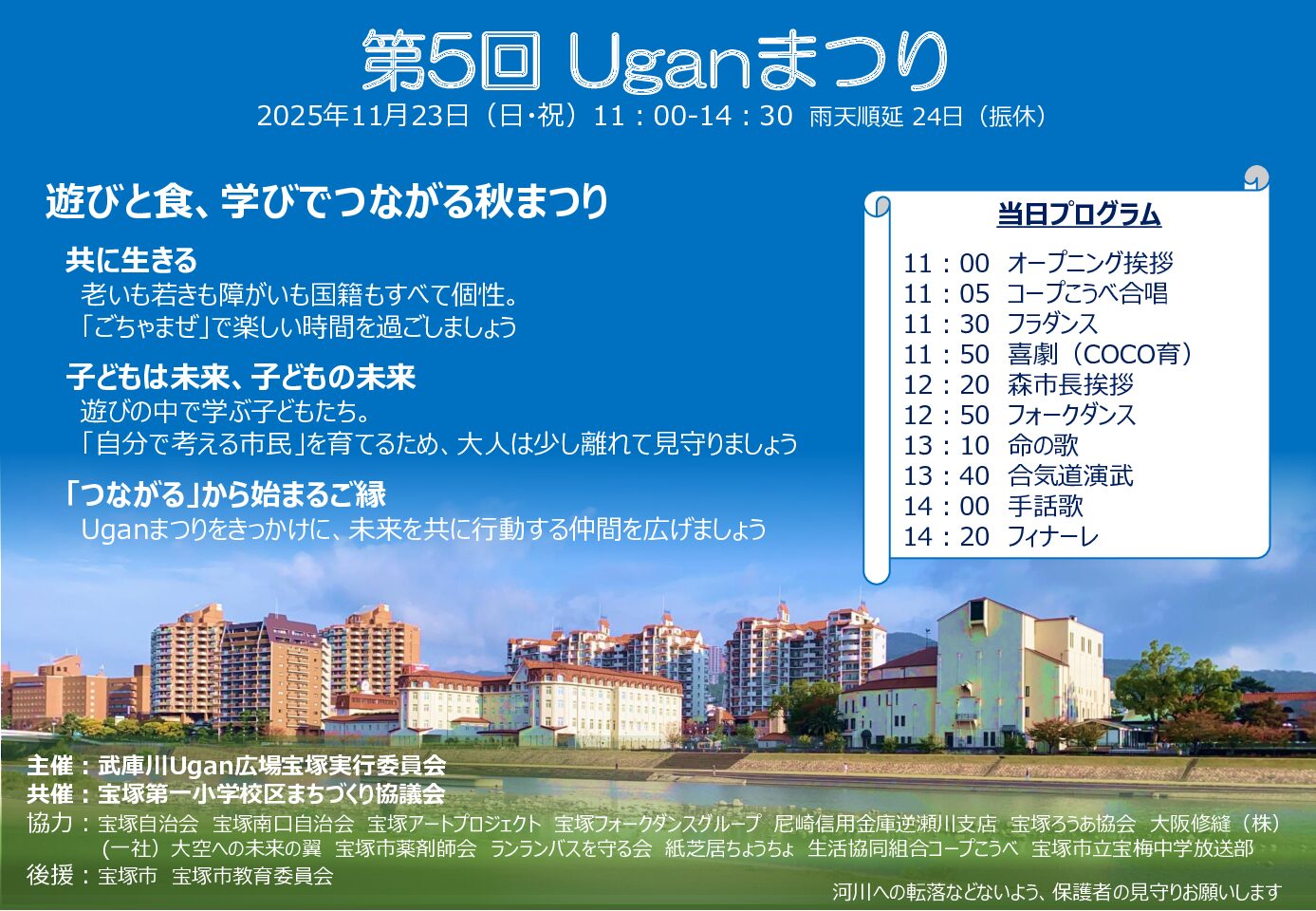 11月23日(日•祝)第5回Uganまつりを開催します。 武庫川右岸広場(宝塚南口駅側)で11:00〜14:30です。 『遊ぶ・食べる・見る•やってみる•作る•買う』のブースは40 中学生のお店、甲子園大学、コープこうべ…