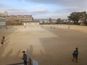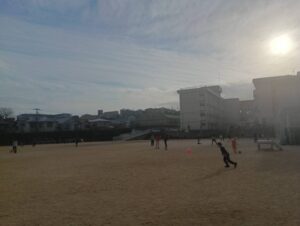 寒風が吹く中で運動場では児童が思い思いに遊びました。