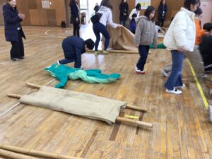 消防のお話毛布担架に挑戦