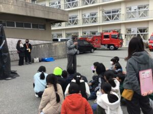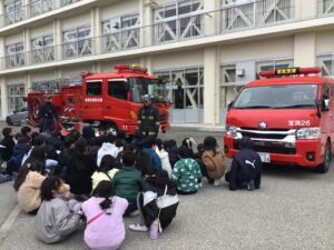 西消防署から消防タンク車が来校、消防士さんのお話にしっかり