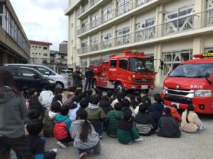 西消防署から消防タンク車が来校、消防士さんのお話にしっかり