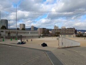 運動場と視聴覚教室(プレハブ校舎)に分かれて思い思い