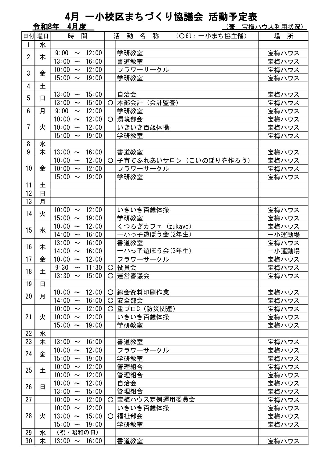 • 4月 活動予定表(宝梅ハウス利用状況) 2026.04.01