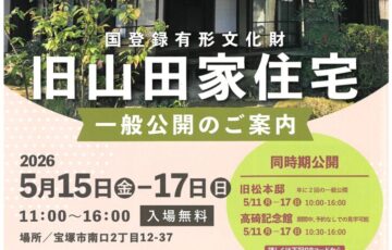 国登録有形文化財の旧山田住宅の一般公開が行われます。 期間:11月7日(金)〜9日(日) 時間:11:00〜16:00 場所:宝塚市南口2丁目12-37(阪急宝塚南口駅徒歩約5分) 近代的和風住宅で1921年建築で…