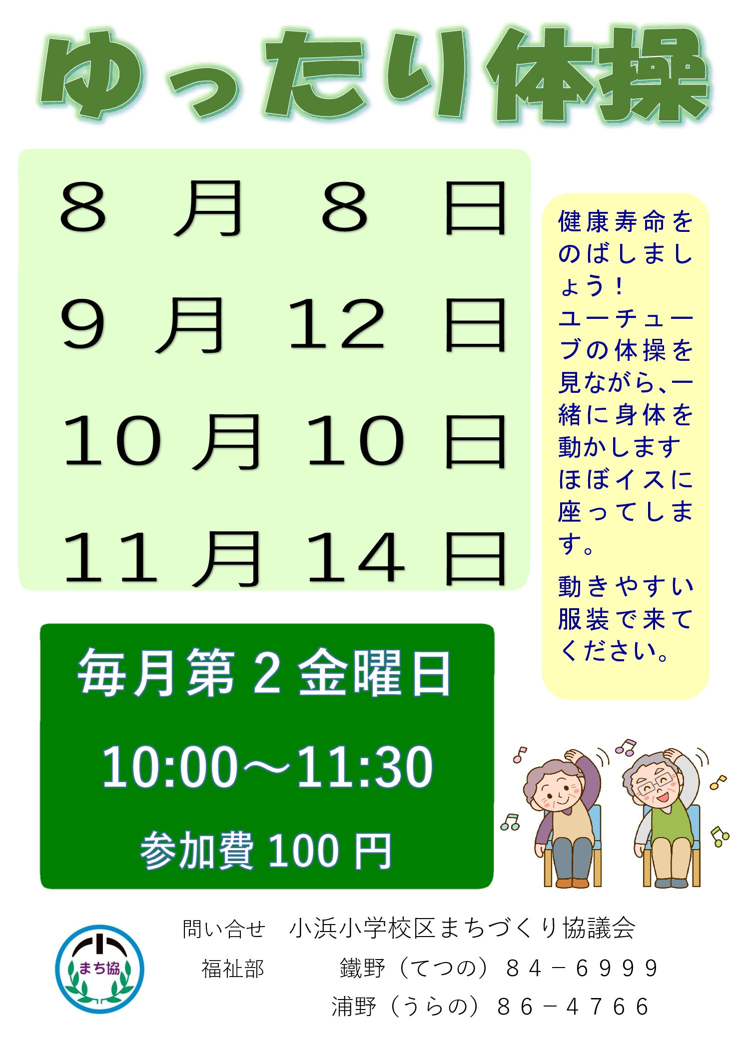 青少年部 ピラティス開催案内 8~11月 2025.08.09 小浜小学校区まちづくり協議会 月2回(第1月曜日、第3月曜日)開催。元タカラジェンヌが講師。基本の呼吸をつかったストレッチでインナーマッスルを鍛え、健康で綺麗な身体が作れます。 参加してみてください。