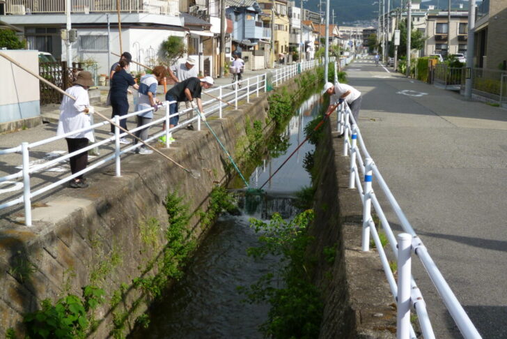 長尺の網や熊手で川の中に落ちている空き缶、ペットボトル、燃えるごみを回収しました。