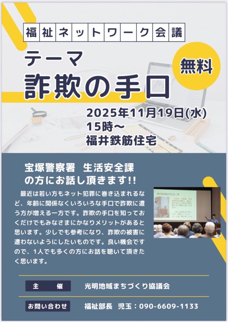 2025.09.20 福祉部 このページを印刷 光明地域コミュニティ 第2回福祉ネットワーク会議について 福祉ネットワーク会議のテーマ『詐欺の手口』 宝塚警察署生活安全課の方に来訪していただきます。 特殊詐欺の被害額は2025年1月~6月で597億円と前年の2.6倍に増加しているようです。 警察官をかたった詐欺、若年層が標的になる詐欺が増えているようです。 福祉ネットワーク会議に是非参加してみて下さい。