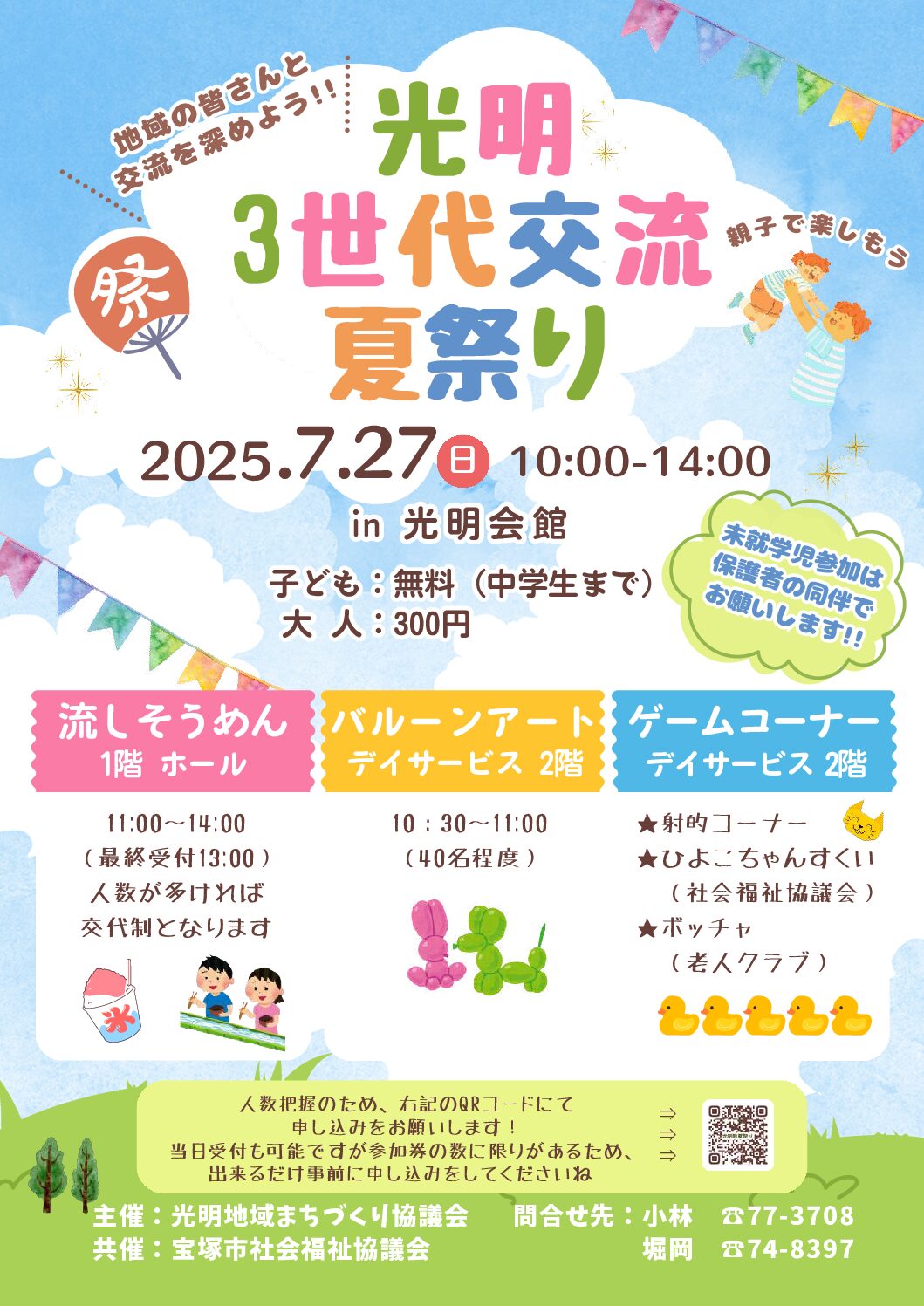 主催:光明地域まちづくり協議会 共催:宝塚市社会福祉協議会 夏まつりは今回が初めての試みでした。(以前は光明小校区まつりとして開催されてました) 7月27日は大変な猛暑の中での開催でしたが150人(子ども71人、大人79…