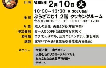ぷらざこむ1で男の料理教室を開催いたします。 2月10日 (火)10:00〜13:00 ぷらざこむ1 2階 クッキングルーム 先着20名(年齢不問) 参加費:お1人500円(当日お持ち下さい) ハガキまたはメールで受付し…
