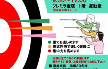 3月25日(水)9時半~12時 フレミラ宝塚でスポーツ吹き矢体験教室を行います。 参加希望の方は、 申込者(代表者)と同伴者最大1名の 住所・氏名・年齢・電話番号を明記の上、 下記へ郵送して下さい 〒665-0852 宝…