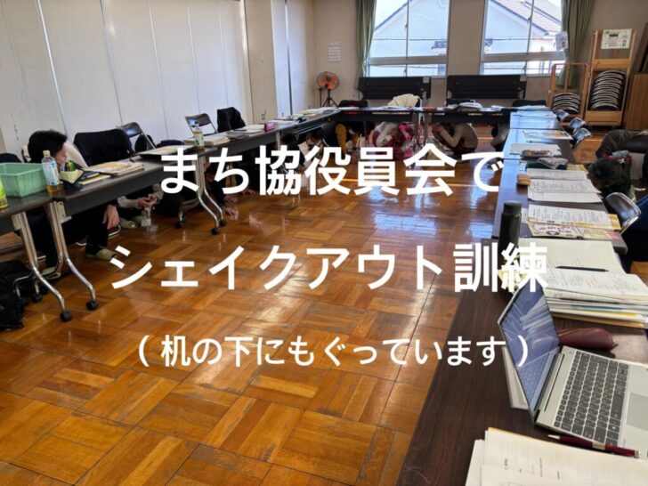 2026.01.19 防災部 このページを印刷 コミュニティ売布 シェイクアウト訓練を実施しました 1月17日(土)役員会にてシェイクアウト訓練を実施しました。 地震の揺れから身を守る安全行動(1:姿勢を低くする、2:頭を守る、3:動かない)を約1分間実施するというものです。 今後も、防災意識の向上のため、引き続き訓練などを実施します。