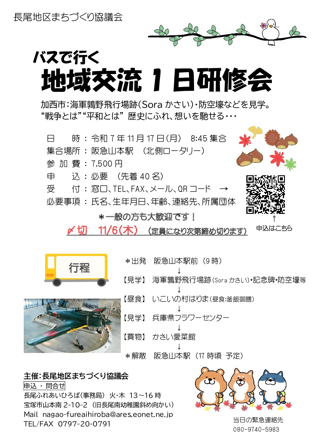 朝晩が涼しくなり、ようやく過ごしやすい季節となってきましたね 今年も「地域交流研修会」を実施することとなりました。 行き先は 加西市 です。 海軍鶉野飛行場跡(Soraかさい)への訪問を予定しています。 終戦から80年を…